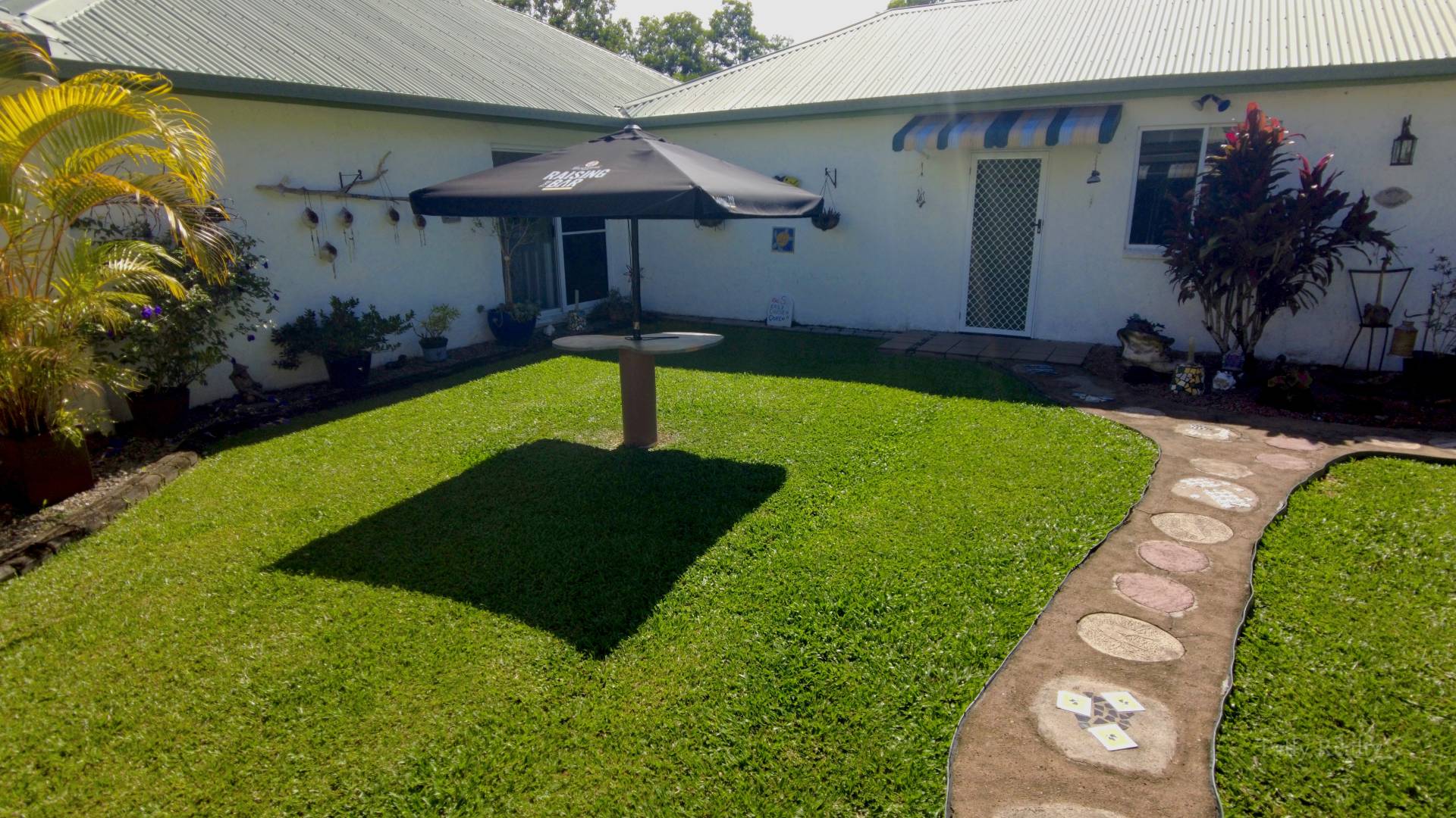 You arrive the castle style front entry with a large living room on one side and the huge kitchen on the other if you keep walking ahead your will walk through to the grassy court yard across which you can enter 2 of the ground level bedrooms both with en suites. This allows these bedrooms to be private guest rooms with access to the living area.